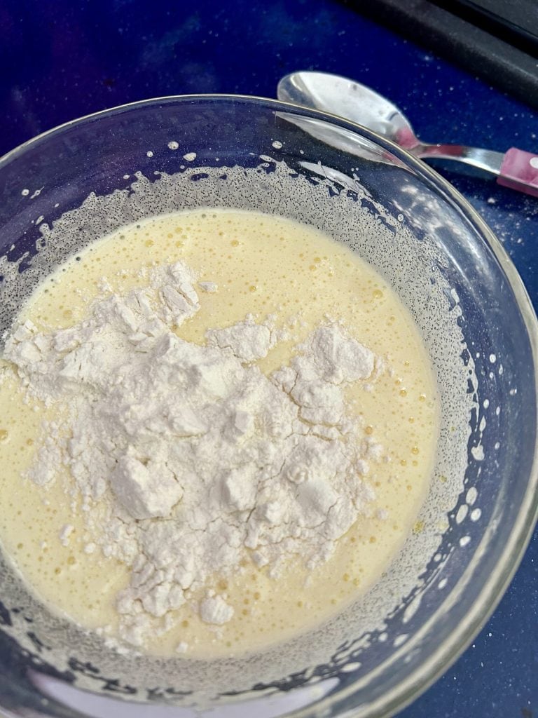 Adicione a farinha e continue a mexer delicadamente (melhor com uma espátula ou em baixa velocidade com os batedores), até obter uma mistura homogênea, sem grumos.