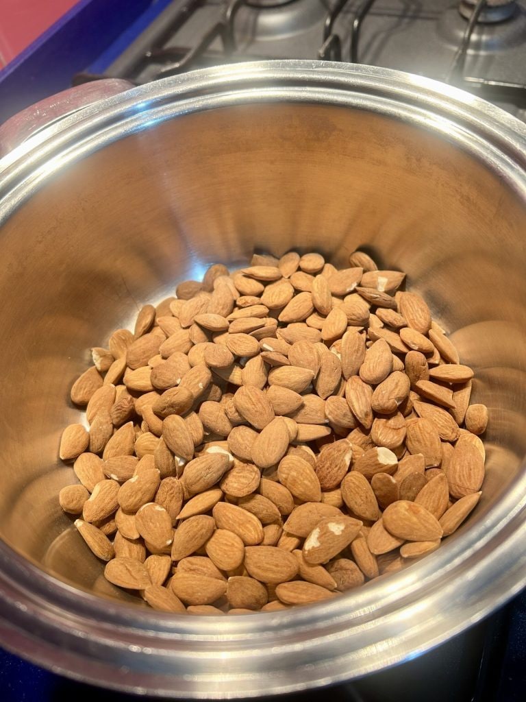 Coloque as amêndoas na panela e leve ao fogo médio, mexendo por alguns minutos antes de adicionar o açúcar.