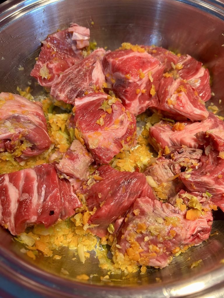 Adicione o ensopado ao refogado e deixe dourar bem de todos os lados, mexendo frequentemente. Despeje o vinho branco e deixe o álcool evaporar. Neste ponto, adicione o tomate, mexa e ajuste o sal.