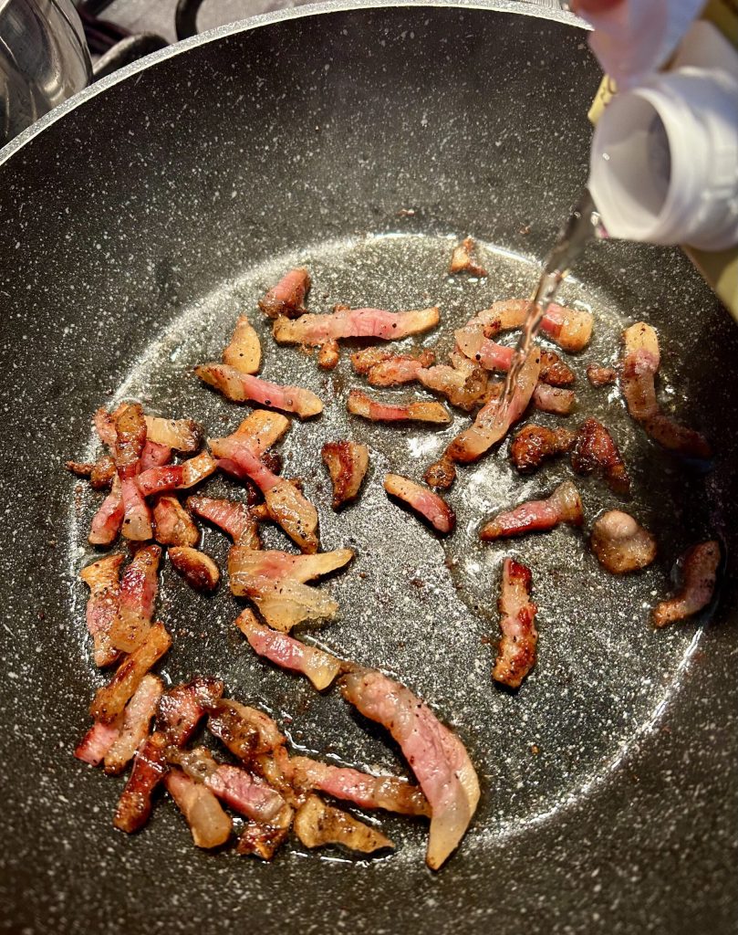 Quando o espaguete estiver quase cozido, reacenda o guanciale e passe a massa no guanciale. Para escorrer a massa, recomendo o uso apenas do garfo apropriado para espaguete. Levante-os da água, espere a água escorrer e leve-os diretamente à frigideira, isso permite manter a quantidade certa de água que manterá a massa macia.