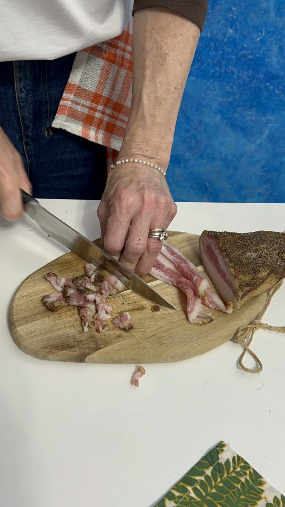 O guanciale nesta receita não pode ser substituído por pancetta, pois seu sabor e composição rica em gordura permitem que você não adicione óleo à receita.