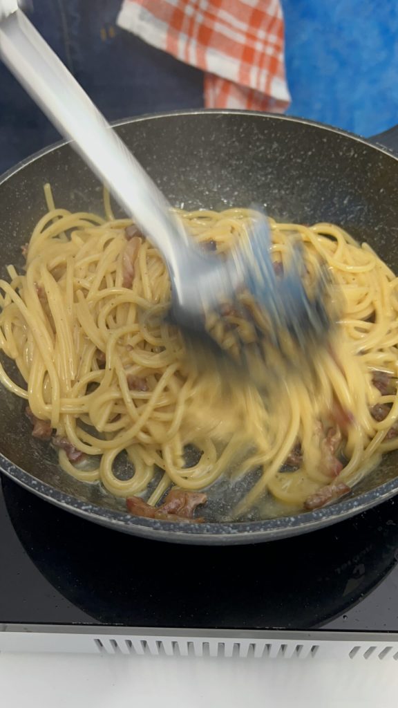 A massa deve ser passada no guanciale crocante para absorver todo o sabor, mas o creme de ovo deve ser adicionado rigorosamente fora do fogo. O ovo não deve cozinhar pois deve permanecer cremoso e não se tornar uma omelete.