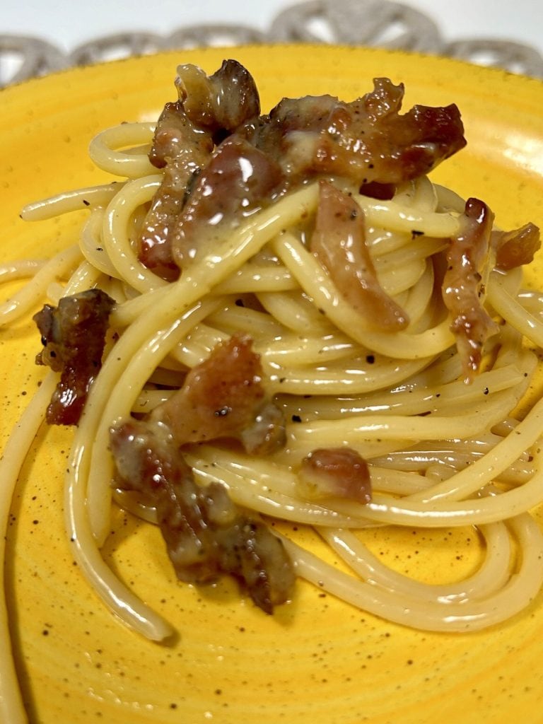 Espaguete à carbonara, um prato típico da Itália especialmente da cozinha laziale, preparado com três ingredientes insubstituíveis: guanciale, ovo e pecorino.