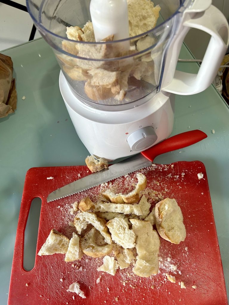 Quebre o pão dormido com a ajuda de uma boa faca para pão e coloque-o na tigela do processador.