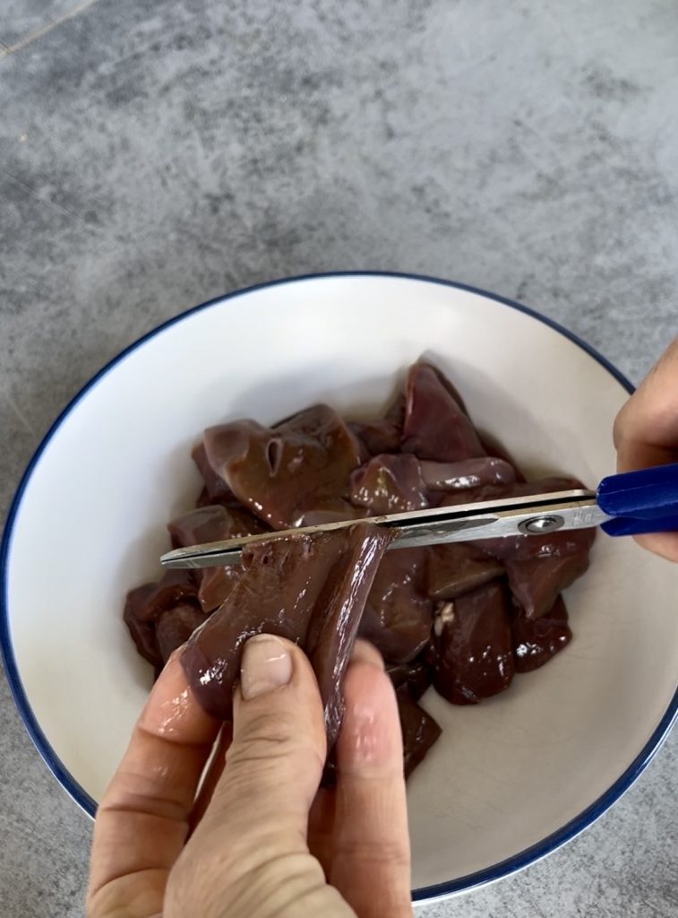 Enquanto a cebola está dourando, cortamos o fígado em pedaços, eu uso uma tesoura de cozinha para isso, mas você também pode cortá-lo em tiras com uma boa faca de chef.