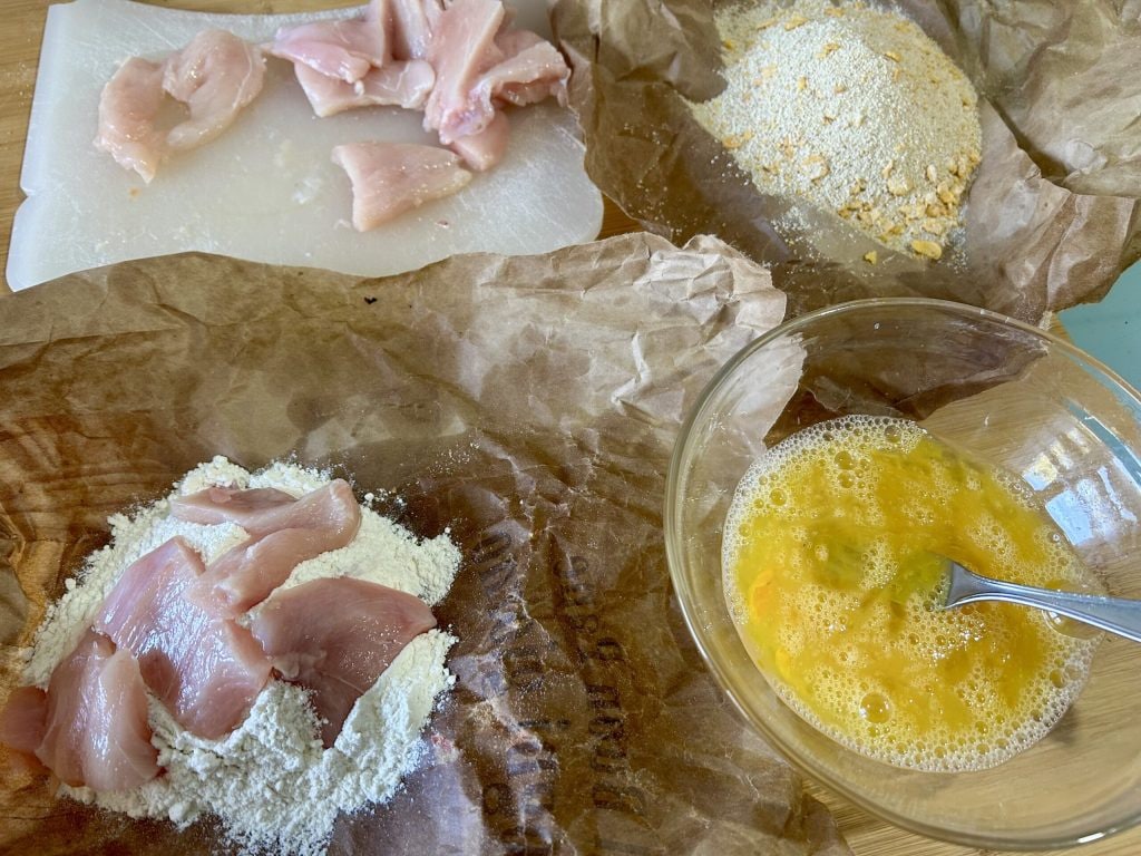 Pegamos cada pedaço de frango e passamos primeiro na farinha, depois nos ovos batidos com uma pitada de sal e pimenta, e finalmente na farinha de rosca.