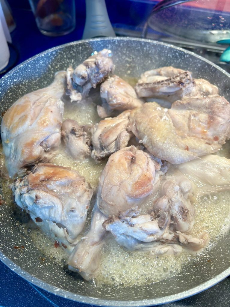 • Prepare o frango removendo completamente a pele e cortando-o em pelo menos 8 pedaços. Pessoalmente, usando a tesoura de cozinha, corto começando pela divisão do peito, depois seguindo a linha das costas, divido primeiro em dois, depois em quatro, separando as coxas das asas e cortando em dois cada quarto de frango.