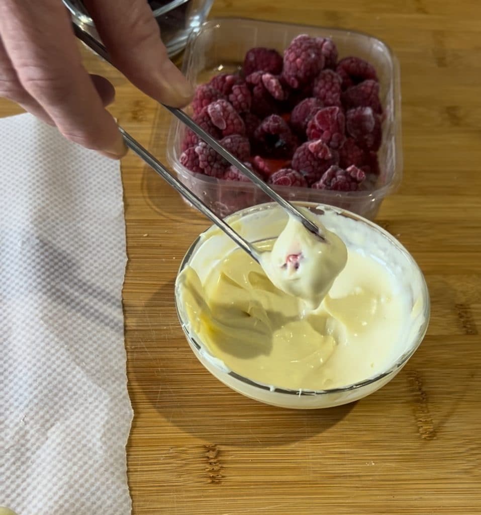 Lave delicadamente as framboesas em água fria e seque bem com papel toalha. Para facilitar a cobertura com o chocolate, recomendo colocá-las no freezer por pelo menos 30 minutos: assim ficarão mais compactas e o chocolate aderirá melhor.