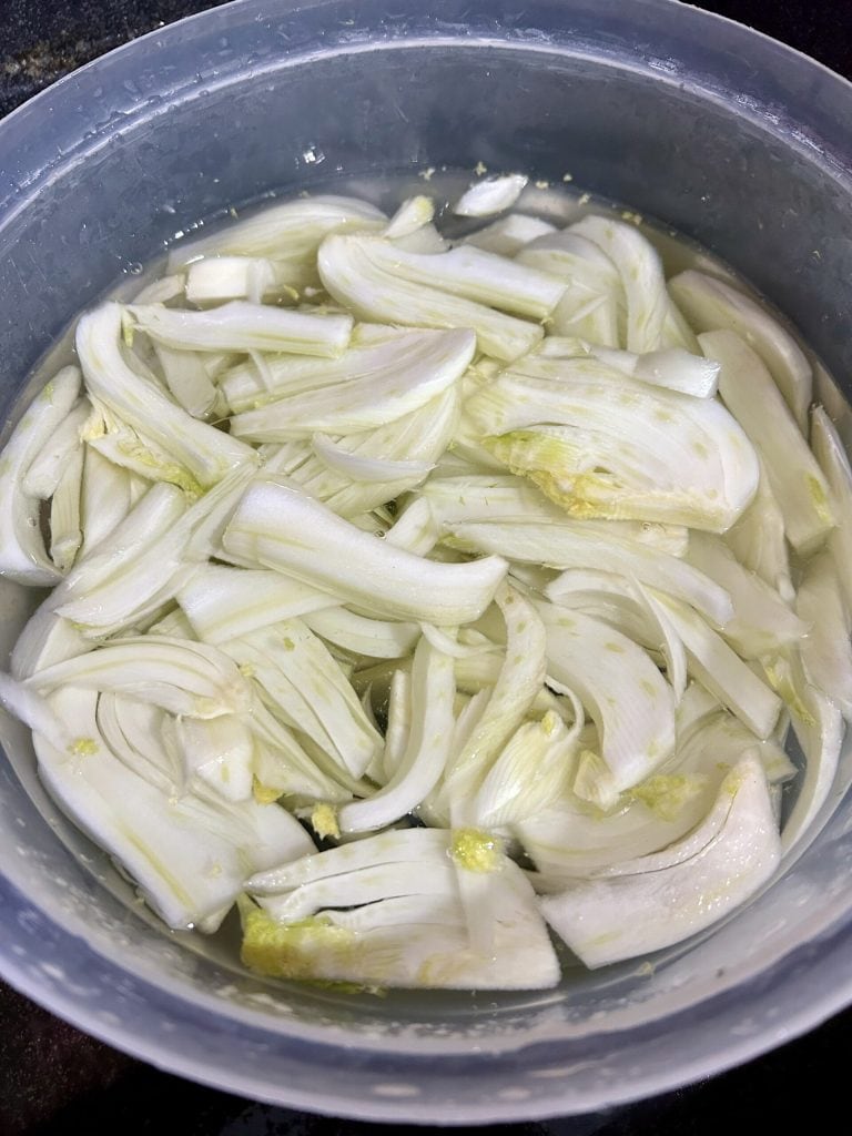 Recomendo cortar o funcho em fatias no sentido vertical e fazer fatias bem finas para tornar o cozimento mais rápido. Se durante o cozimento perceber que o molho está se reduzindo muito e o funcho ainda não está cozido, não se preocupe, basta adicionar um pouco de água e esperar que as fatias de funcho fiquem macias.