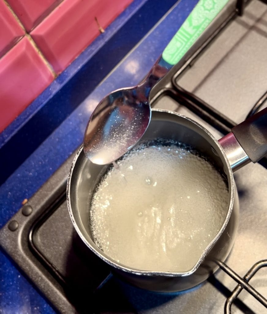 • Coloque quase toda a água na panelinha, reservando um pouco em um copinho de café, que será usada para dissolver o amido. Adicione todo o açúcar à água com algumas gotas de suco de limão e leve ao fogão até ferver.