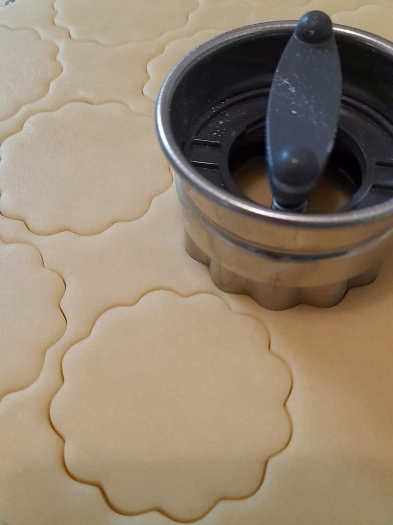 Com o rolo, estenda até obter uma espessura uniforme, nem muito fina nem muito grossa. Neste ponto, use o cortador de biscoitos maior, aquele com bordas onduladas, e corte os discos que formarão as pétalas de nossos girassóis.