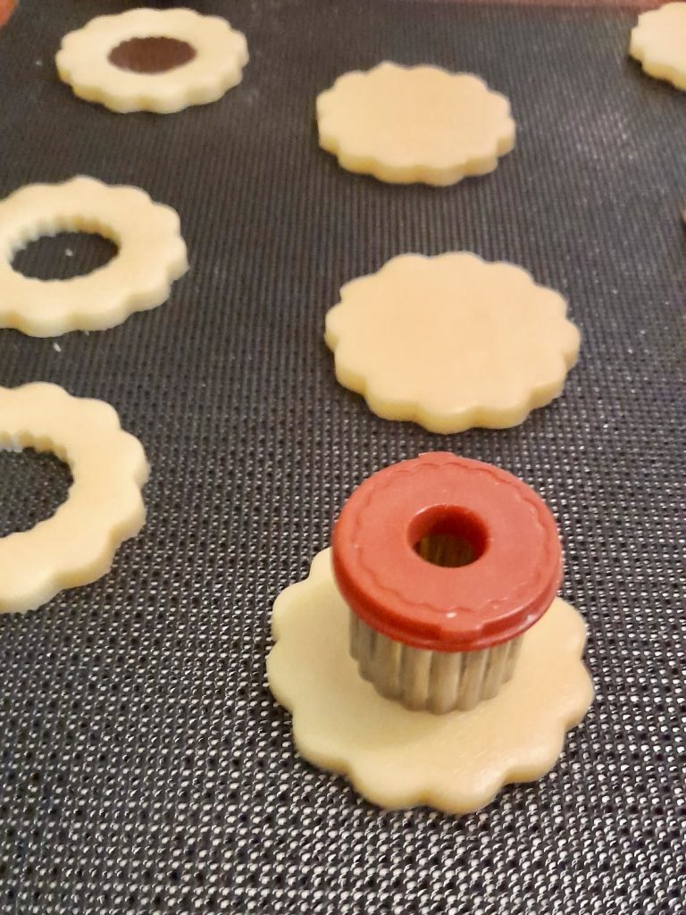 Depois de cortar as flores de massa amanteigada clara com o cortador de biscoitos maior, pegue o menor e corte delicadamente o centro de cada flor.