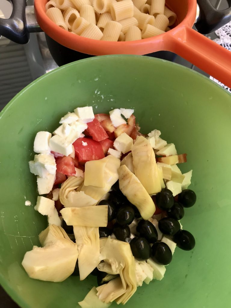 Enquanto prepara o macarrão, lave os tomates, corte-os em cubos e coloque na tigela, adicione os corações de alcachofra cortados, as azeitonas pretas, a muçarela e o emmental, ambos cortados em cubos. Ajuste com sal, pimenta, azeite e manjericão picado à mão para não escurecer.