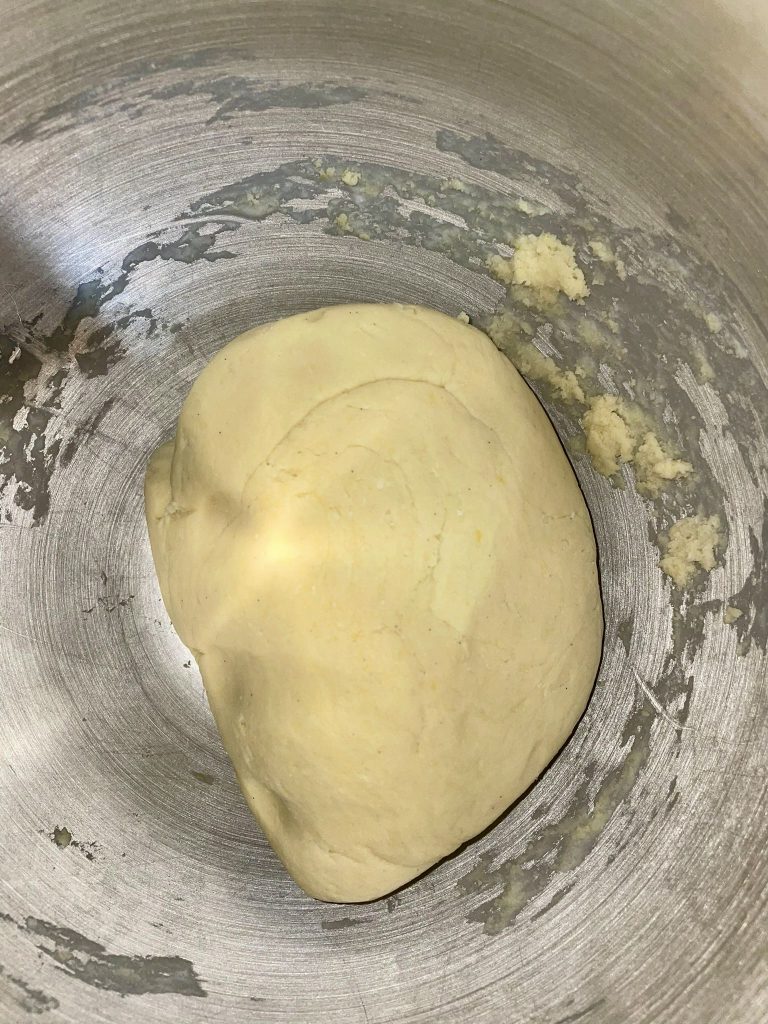 Se estiver misturando à mão, coloque a farinha em forma de montinho na bancada de trabalho, despeje no centro o açúcar de confeiteiro e o ovo inteiro. Com a ajuda de um garfo, comece a misturar, adicione a seguir a baunilha, o creme de leite, o fermento e o bicarbonato. Quando estiverem integrados, comece a adicionar a manteiga e a margarina. Se estiver usando uma batedeira planetária, siga a mesma ordem para adicionar os ingredientes na batedeira e misture com a pá em velocidade média/baixa.