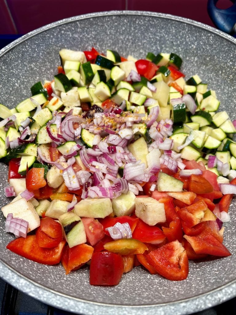 Coloque todos os legumes cortados na frigideira, incluindo a cebola, adicione sal, pimenta, óleo e água. Leve a frigideira ao fogo coberta com a tampa e deixe em fogo alto por cerca de 5 minutos.