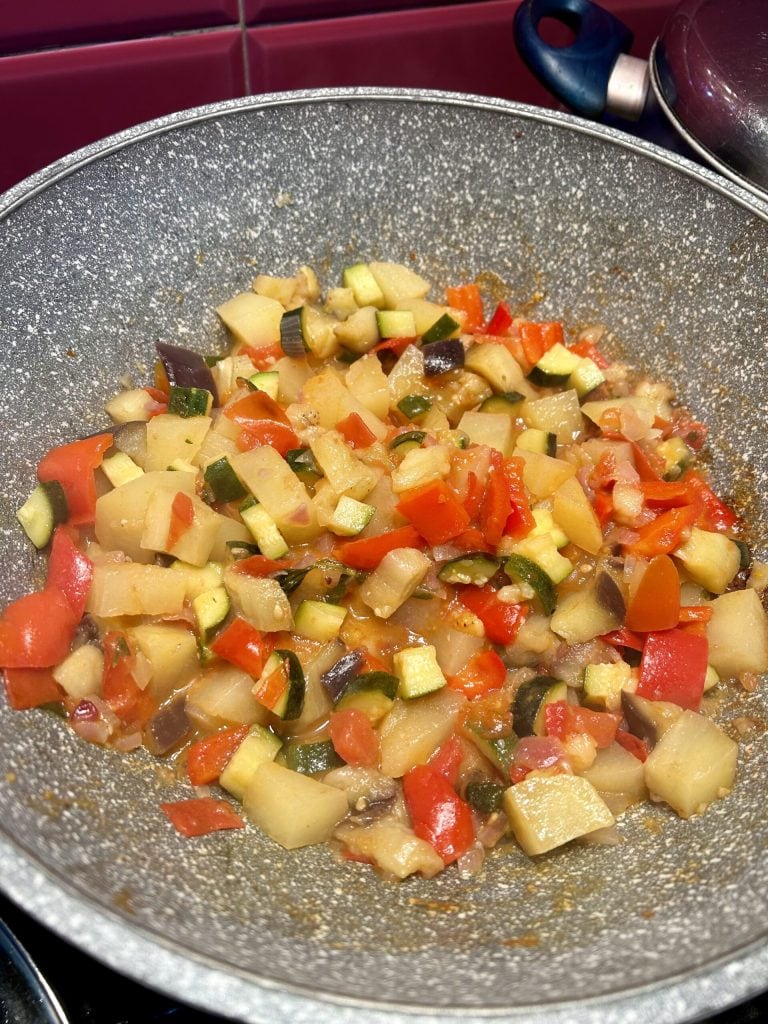 Misture os legumes na frigideira e abaixe um pouco o fogo, mas não muito porque eles não devem cozinhar demais, precisam também dourar. Durante o cozimento deve ficar o molho e recomendo, se reduzir, adicionar um pouco mais de água, mas deve ser um cozimento vigoroso onde os legumes mantenham sua consistência e não se desfaçam completamente. Após cerca de 25 minutos, verá que estarão completamente cozidos, sempre verifique se estão espetando-os com um garfo.