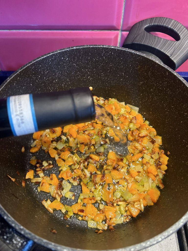 • Limpe e lave bem a cebola, o alho, o aipo e a cenoura. Com a ajuda de uma boa faca com lâmina lisa e uma tábua de corte, corte-os em pedacinhos o mais homogêneos possível. Coloque todos os temperos cortados na panela, adicione o azeite e a pimenta e deixe dourar em fogo médio, cubra a panela com a tampa e mexa de vez em quando para dourar os temperos de maneira uniforme.