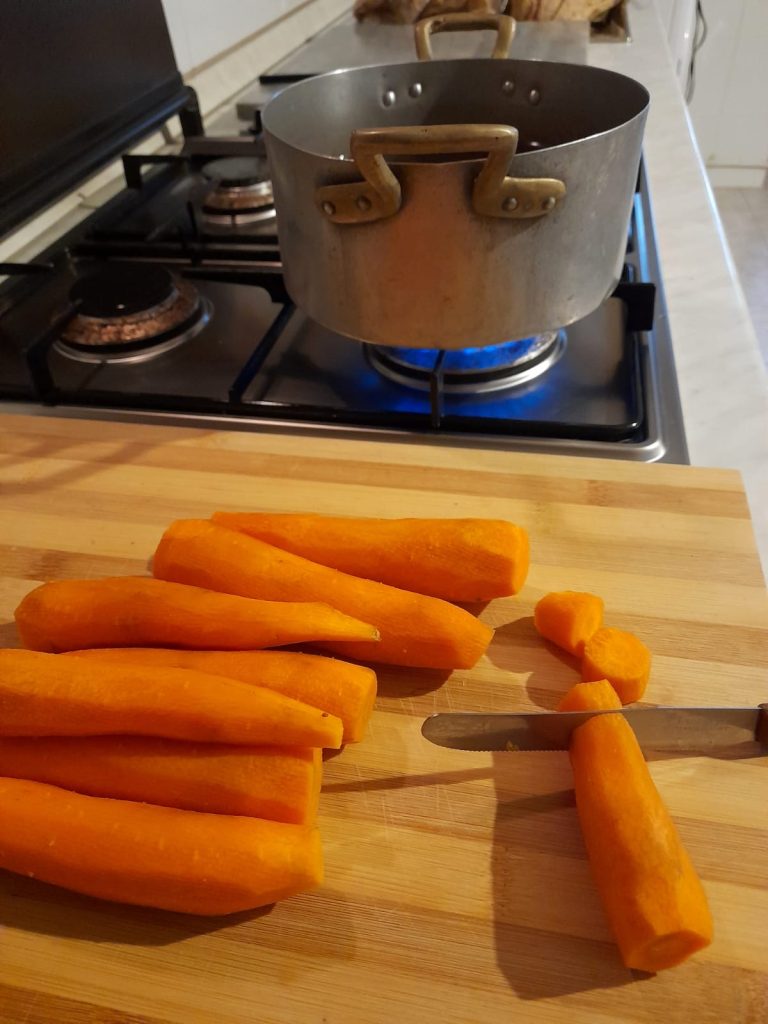 Limpe bem as cenouras e cozinhe em água fervente até que fiquem bem macias. Você pode cozinhá-las inteiras ou em pedaços, como preferi, e o tempo de cozimento vai variar conforme o tamanho das cenouras. Quando estiverem bem macias, escorra e deixe esfriar por cerca de 10 minutos.