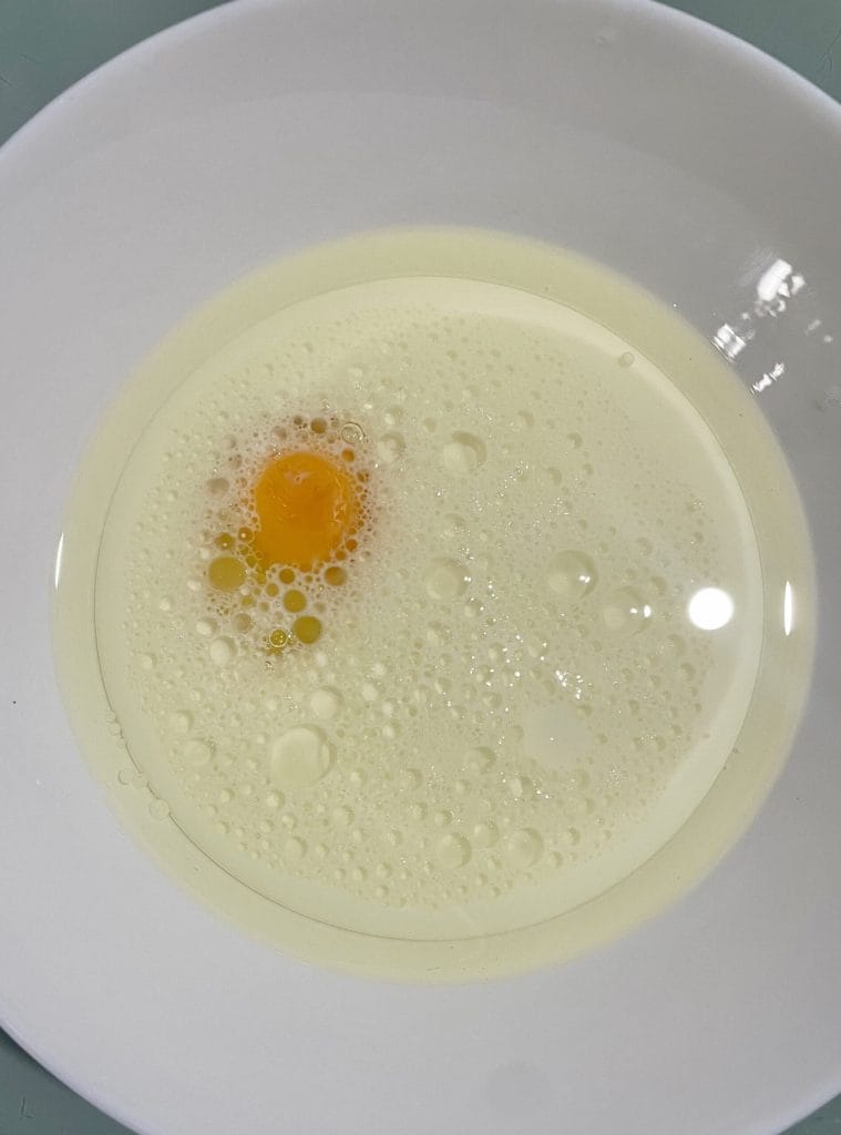 Em outra tigela, misture os ingredientes líquidos: o ovo, o óleo de sementes e o leite.
