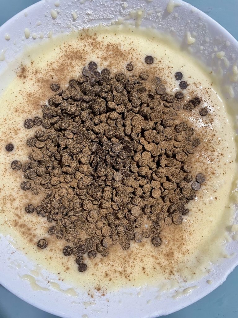 Finalmente, incorpore delicadamente as gotas de chocolate e a canela, mexendo tudo para obter uma massa bem distribuída e homogênea.