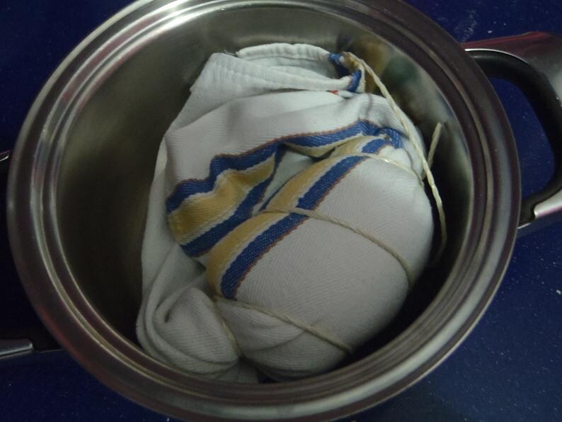• Para preparar o panetone a tempo, é necessário refrescar o fermento natural na sexta-feira por volta das 17:30. À noite, por volta das 21:00, procede-se à amarração: faz-se um novo refresco utilizando 100 g de fermento natural já refrescado, 100 g de farinha manitoba e 50 g de água morna. Como mostrado na foto, é preciso envolver o fermento natural em um pano e amarrá-lo bem, como um salame, com um cordão de cozinha. Em seguida, colocá-lo em uma panela que o contenha bem (não deve ser muito grande) e deixá-lo descansar a noite toda.