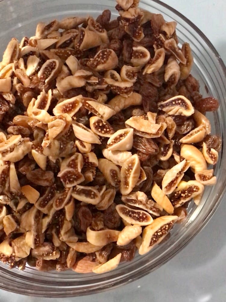 Coloque as passas em uma xícara cobrindo-as com água morna e deixe-as de molho por pelo menos 5′. Agora pegue todas as frutas secas, coloque-as na tigela de vidro e adicione os figos secos cortados em pedacinhos com a tesoura.