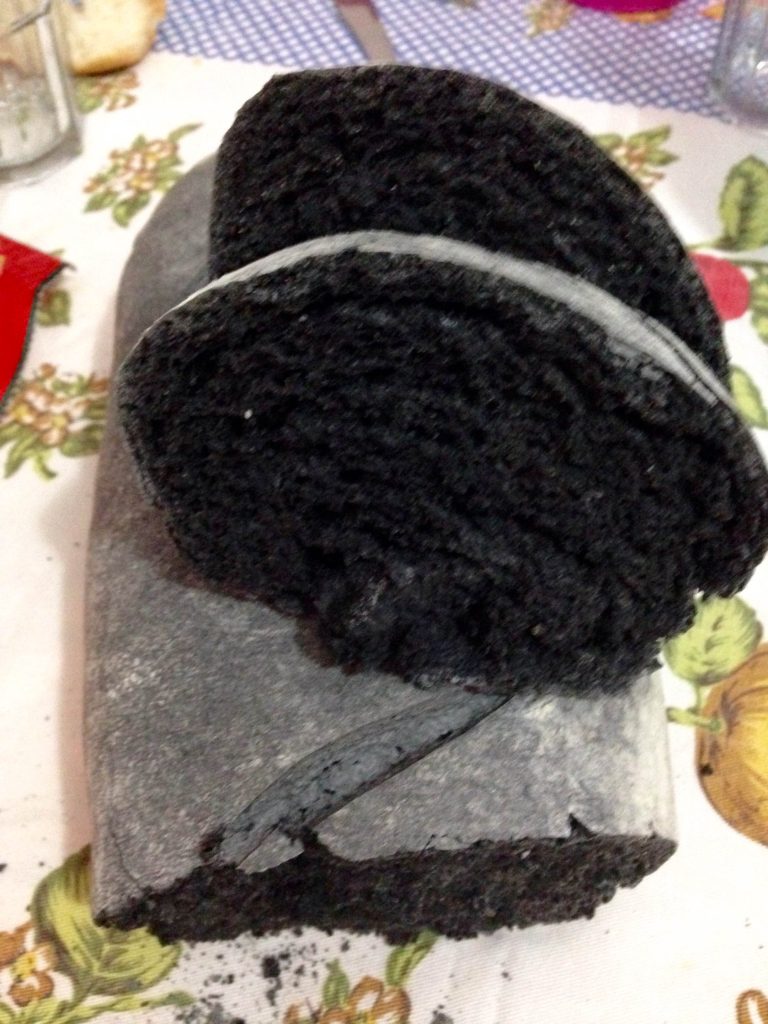 Pão com carvão vegetal, um pão muito cenográfico pela cor e rico em diversas propriedades, com crosta crocante e interior muito macio.