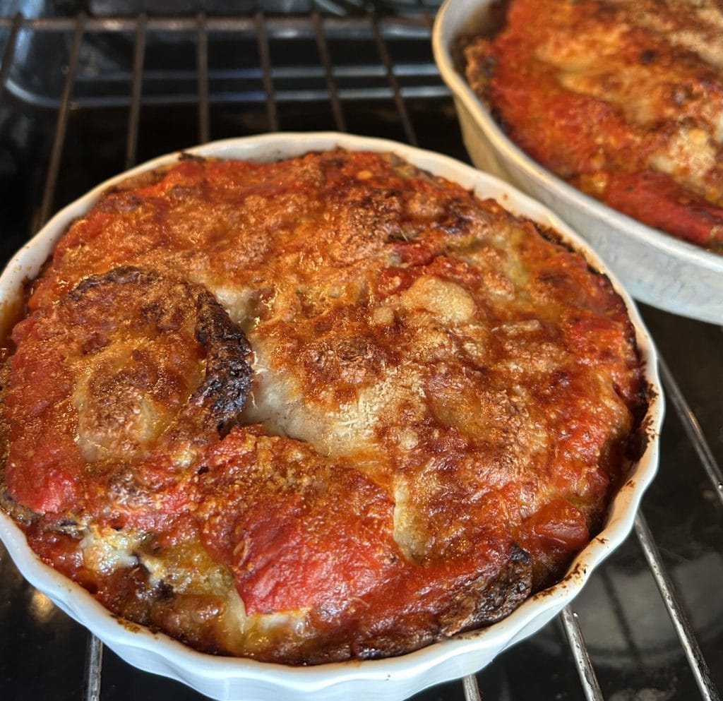 • Agora só falta cozinhar a parmegiana. Se usar o forno, pré-aqueça a 220°C e coloque a forma no forno por cerca de 20 minutos, ou até que a superfície esteja bem dourada e gratinada. Como alternativa, você pode usar a fritadeira a ar: ajuste para cerca de 200°C e cozinhe por 15 minutos, até obter uma superfície levemente tostada e crocante.