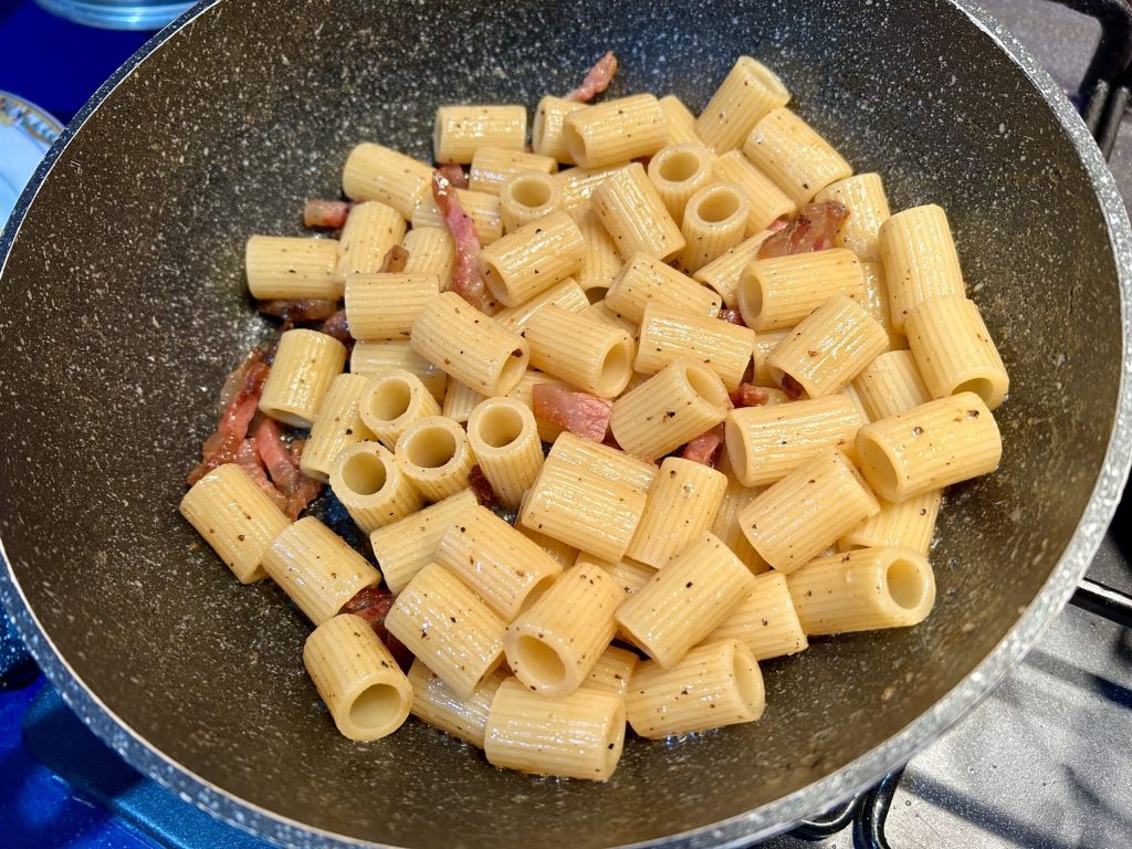 Mesmo este hábito de dourar o guanciale para depois reservá-lo e usá-lo apenas como guarnição não faz parte da receita original. O guanciale deve ser bem dourado e com ele a pasta é passada antes de adicionar o ovo, e é por isso que os rigatoni e as mezze maniche são o formato mais adequado para abraçá-lo por dentro.