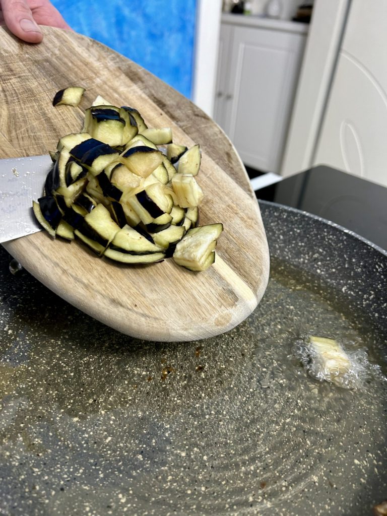 • Após o tempo de repouso, pegue as berinjelas, coloque-as pouco a pouco sobre a tábua de corte e, com uma faca bem afiada de lâmina lisa, corte-as em pedaços. Eu pego 4/5 berinjelas, sobreponho umas às outras, depois procedo ao corte primeiro com cortes verticais e depois cruzo horizontalmente. Enquanto corta as berinjelas em cubos, coloque uma frigideira no fogo com o óleo de sementes e leve à temperatura para fritar. Quando o óleo estiver bem quente, comece a fritar as berinjelas.