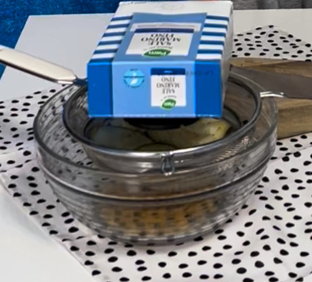 • A primeira etapa é cortar as berinjelas em fatias não muito finas, colocá-las em um escorredor, uma próxima à outra criando várias camadas de berinjelas e salgar um pouco cada camada. Depois de fatiar todas, cubra com uma tampa menor que a circunferência do escorredor, para poder pressionar bem as berinjelas. Ajude-se nessa operação posicionando um pequeno peso sobre a tampa. Coloque o escorredor sobre uma tigela ou na pia, porque as berinjelas liberarão sua água naturalmente amarga. Deixe as berinjelas repousarem assim por pelo menos 30 minutos, mas pode ser mais.