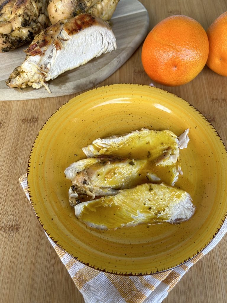 O preparo do peito de frango à laranja não é trabalhoso e não requer marinada, mas é importante temperar bem a carne massageando-a com ervas aromáticas.