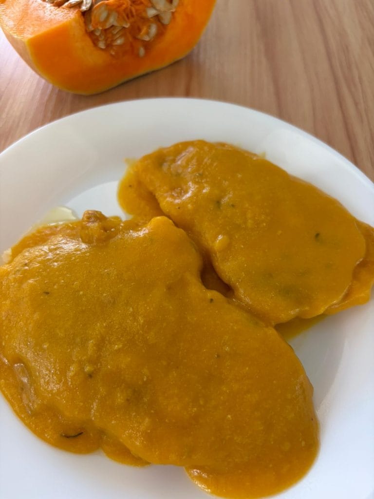 O peito de frango com creme de abóbora é um segundo prato simples e deliciosíssimo, perfeito para o outono. Descobri esta receita nas redes sociais e me conquistou imediatamente, porque combina ingredientes que adoro e é realmente rápido de preparar. O resultado é um prato cremoso, saboroso e de aroma irresistível, ideal para quem quer levar à mesa algo rápido mas cheio de sabor. O bom dessa receita é que pode ser preparada antecipadamente: basta aquecê-la com um pouquinho de leite e será tão boa quanto acabada de fazer. Rápido não significa tristeza na cozinha, e este prato é a prova disso: poucos passos e você levará à mesa um segundo prato cremoso, colorido e cheio de sabor!