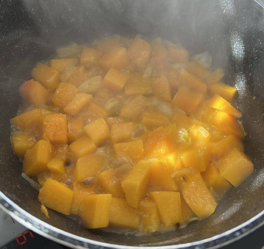 Primeiro, limpamos a abóbora, cortamos em cubos e colocamos em uma panela com um fio de azeite, um pouco de cebola picada e um pouco de sal. Deixamos dourar por alguns minutos, apenas o tempo suficiente para começar a amolecer e ganhar sabor. Neste ponto, adicionamos um pouquinho de água, cobrimos com a tampa e deixamos cozinhar por cerca de dez minutos, até a abóbora ficar macia.