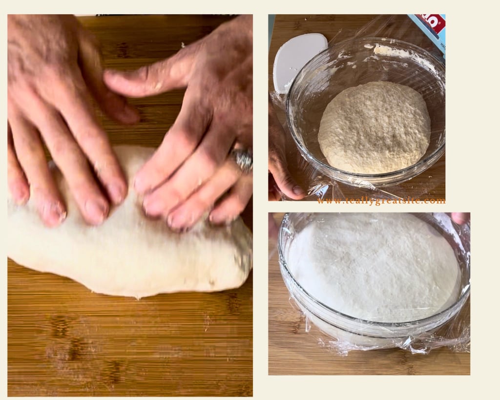 Quando a massa começa a ficar dura, se estiver amassando à mão, coloque-a em uma superfície de trabalho. Não deve ser necessário adicionar mais farinha e amasse energicamente com as mãos até obter uma massa bem elástica. Se estiver amassando com a batedeira planetária, deixe-a funcionar até que a massa se torne compacta e elástica.