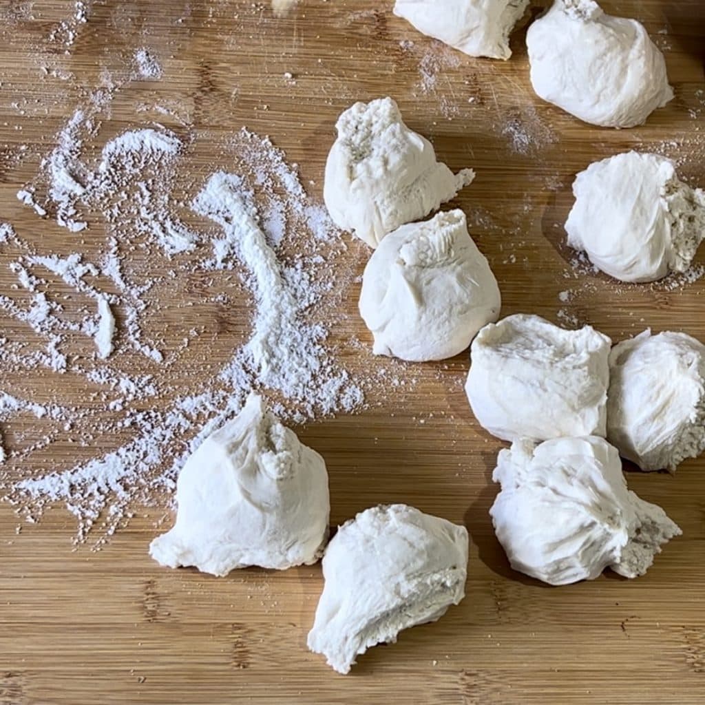 Quando a massa tiver dobrado, coloque-a em uma superfície enfarinhada e com movimentos rotativos alongue-a em um cilindro. Deste cilindro, corte com as mãos tantos pedaços de massa quantas pizzettas você deseja fazer.