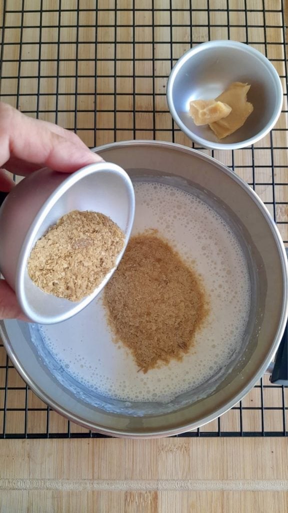 • Continue a preparação adicionando sal, fermento e o Shiro miso, sempre misturando bem com o batedor para incorporar todos os ingredientes.