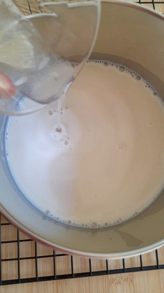 • O primeiro passo para preparar o queijo cremoso é colocar o leite na panela pequena com o suco de limão e deixar coagular por alguns minutos.