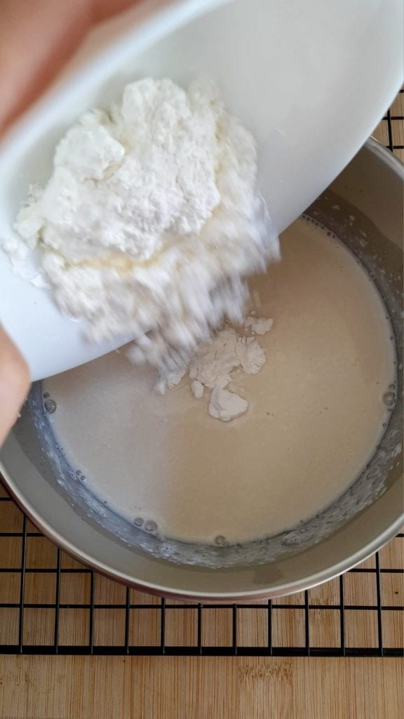 • Após esse tempo de descanso, adicione o amido de milho na panela e misture com o batedor.