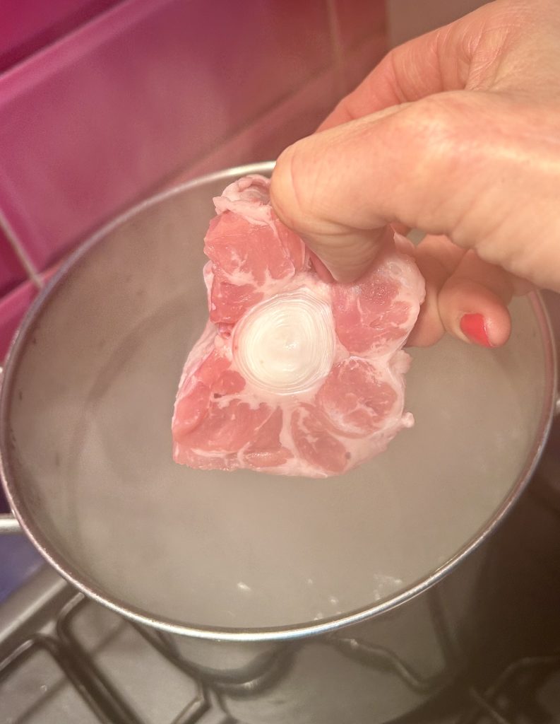 Minha mãe – como muitas mães e avós romanas – me ensinou que primeiro é preciso escaldar, um passo fundamental para eliminar o excesso de gordura e deixar a carne mais limpa e pronta para um cozimento lento e perfeito no molho.Levamos uma panela grande com bastante água e um pouco de sal para ferver.