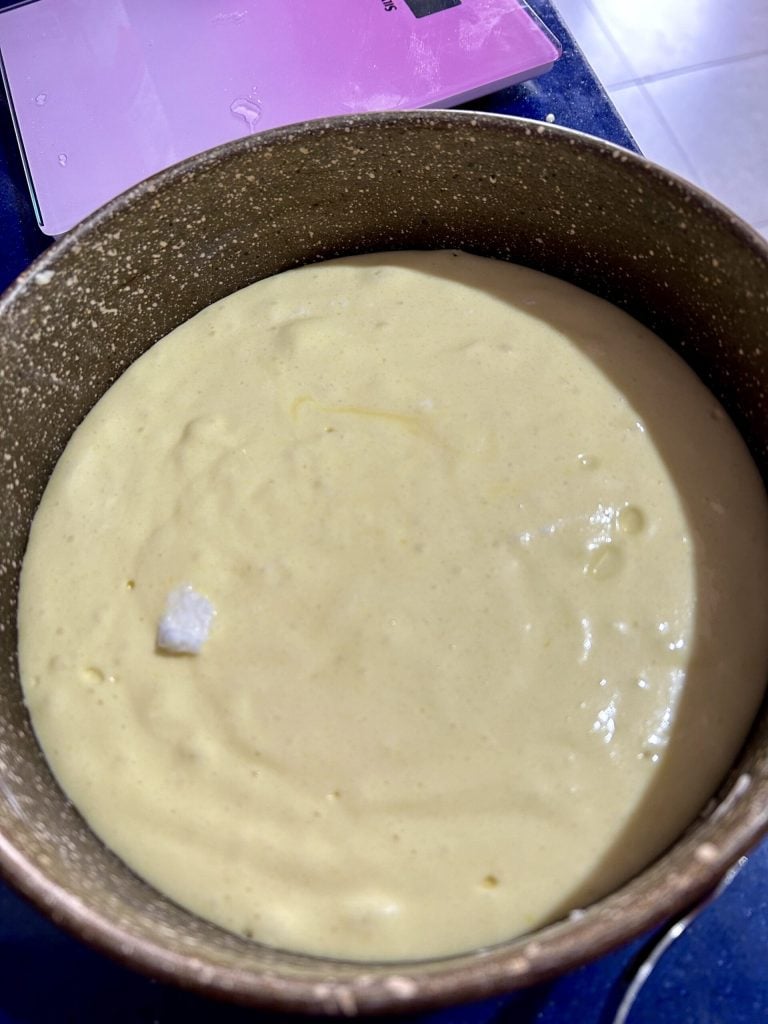 Após as gemas estarem bem batidas, adicione, ainda batendo com o batedor, a manteiga derretida, o chocolate branco também derretido no micro-ondas ou em banho-maria com as duas colheres de leite. Finalmente adicione a farinha e o fermento e misture até obter uma massa homogênea. Quando a massa estiver pronta, desligue o batedor e adicione manualmente, com movimentos circulares de baixo para cima, as claras em pelo menos duas vezes para não as desmanchar muito.