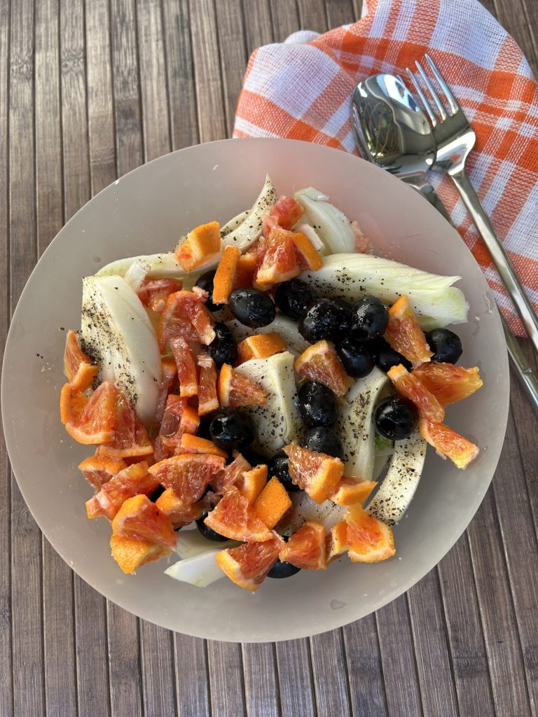 Salada de erva-doce e laranja, um prato simples e rápido de preparar, rico em sabor, ideal como acompanhamento, mas fantástico também entre os aperitivos. Enriquecemos com algumas azeitonas pretas sem caroço, temperado com sal, pimenta e azeite de oliva extra virgem. A laranja temperada tem sempre um sabor muito especial e agradável.