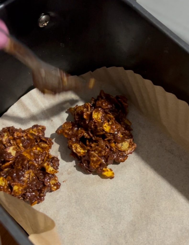 Agora, pegue uma colher de massa por vez e coloque no cesto da fritadeira a ar, ajudando-se com um garfo para formar pequenas montanhas. Cozinhe a 160°C por cerca de 15 minutos, até que o snack esteja crocante por fora e pronto para ser degustado.
