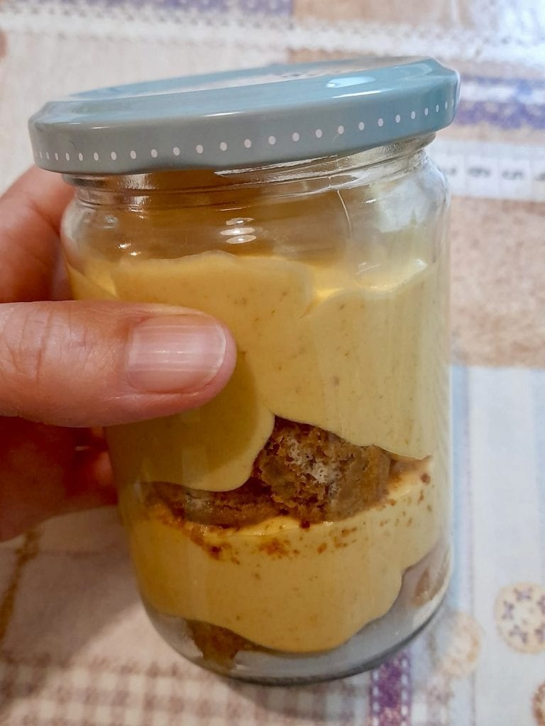 Polvilhe um pouco de amaretti esmigalhados sobre o creme e continue a estratificar, adicionando um novo savoiardi embebido e outra camada de creme em cada pote. Repita até esgotar os ingredientes, terminando com uma camada de creme.