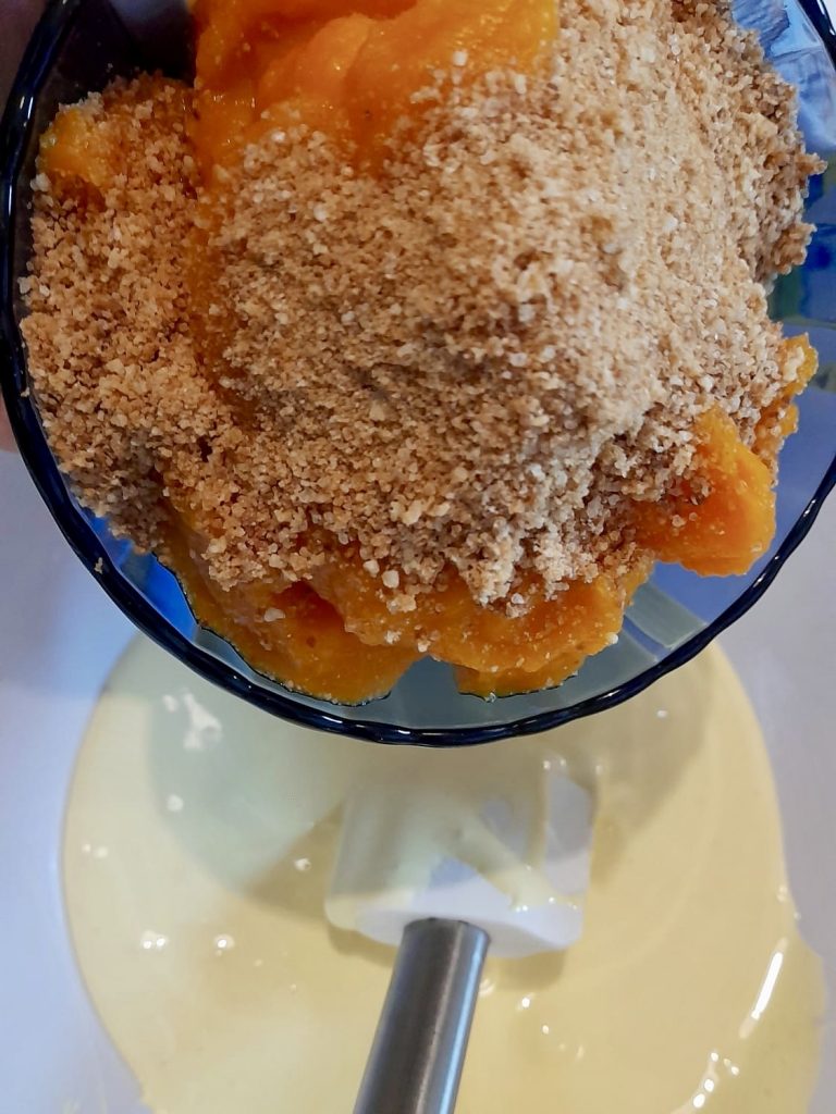 A abóbora deve ser previamente assada no forno e depois transformada em creme com um liquidificador; na receita, adicionamos uma pequena quantidade de gelatina para manter o creme estável. Pessoalmente, preparei a polpa de abóbora com antecedência para eliminar o excesso de água, mas isso é uma dica minha.