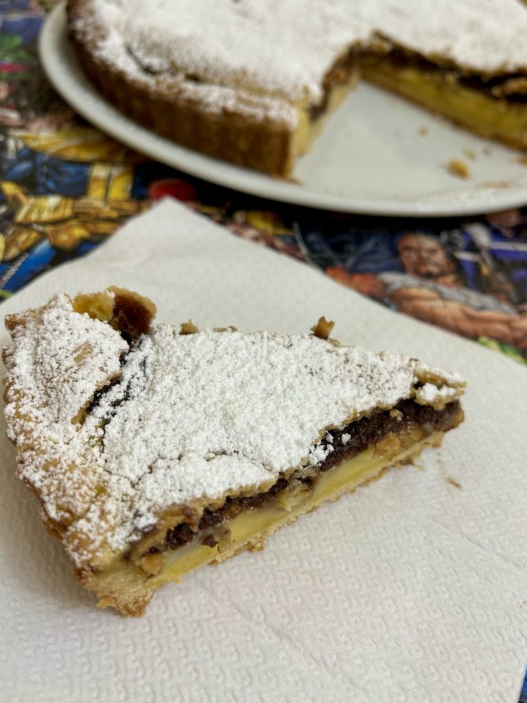 Deixe a torta esfriar completamente antes de cortá-la: assim as duas camadas de creme se compactam perfeitamente e cada fatia fica bonita e limpa. Antes de servir, polvilhei com uma fina camada de açúcar de confeiteiro, que dá um toque elegante e destaca o dourado da massa. Esta torta é ótima também no dia seguinte, pois o creme se estabiliza e o sabor fica ainda mais agradável. Guarde na geladeira e traga à temperatura ambiente alguns minutos antes de saborear.