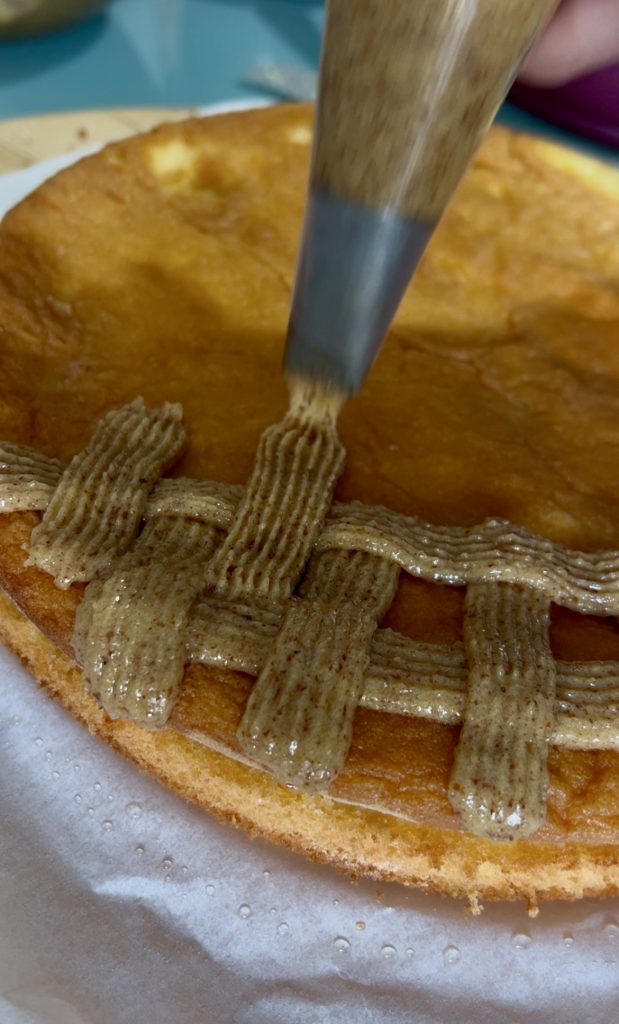 Agora precisamos cobrir a torta com a massa de amêndoas. Coloque a massa no saco de confeitar, montando o bico para cestas, e comece a criar o padrão de cesta na superfície da torta, como mostrado na foto. Uma vez coberta toda a superfície, passe a decorar a borda. Você pode optar por fazer uma cobertura lisa, como eu fiz, ou continuar decorando a borda com o mesmo bico, mas sem formar cestas, para evitar que desçam pela borda da torta.