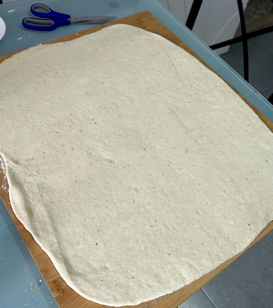 Enquanto a massa está levedando, prepare todos os ingredientes do recheio em pedaços, inclusive os ovos cozidos. Quando a massa tiver levedado, coloque-a sobre a bancada levemente enfarinhada e estenda-a em um grande retângulo com espessura de 3/4 mm.