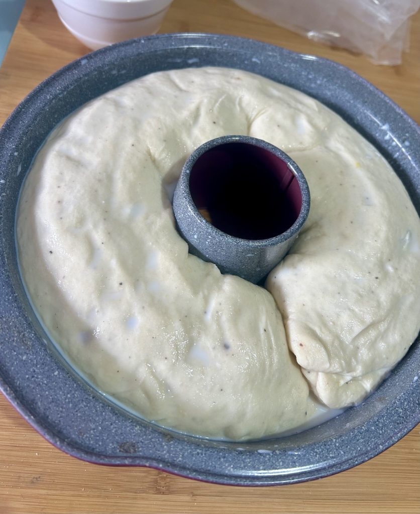 Coloque o rolo obtido na forma de rosca. Se usar uma boa forma antiaderente, não será necessário untá-la.