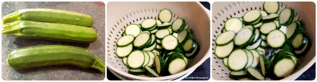 Lave bem as abobrinhas, corte em rodelas não muito finas com a ajuda de um mandolim, coloque-as em um escorredor de macarrão com uma tigela embaixo, polvilhe com sal, depois misture e deixe por cerca de 1 hora, misturando de vez em quando, se desejar.